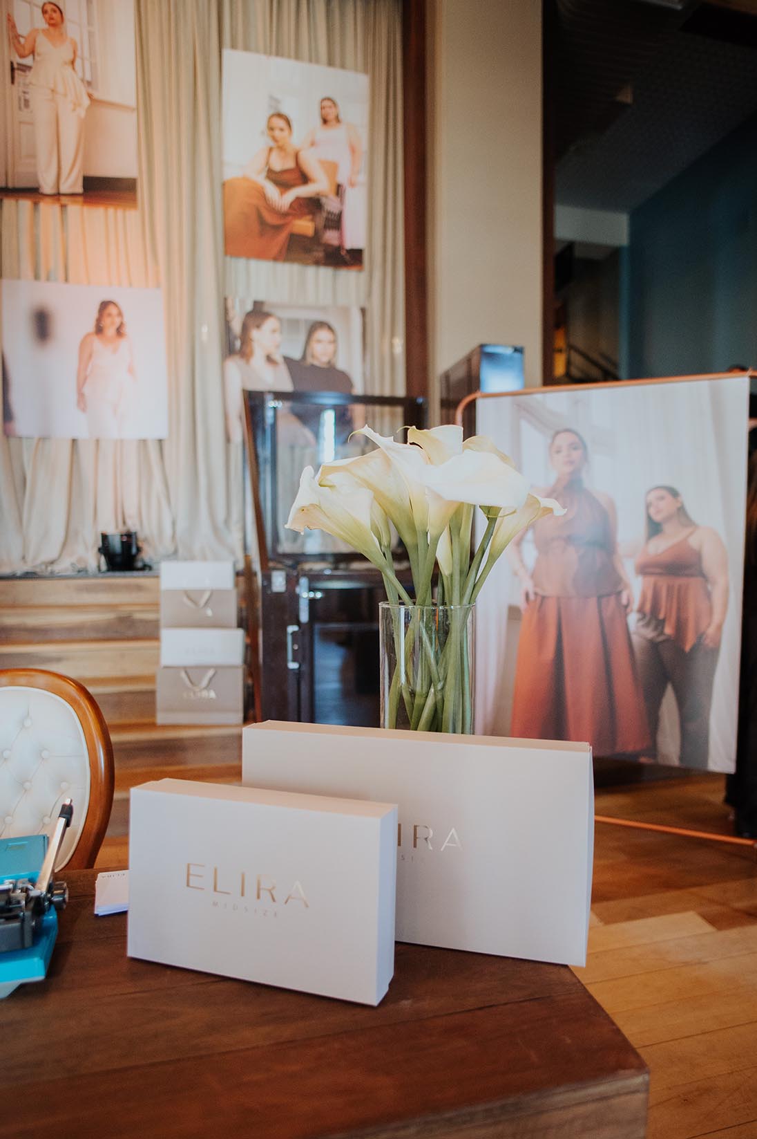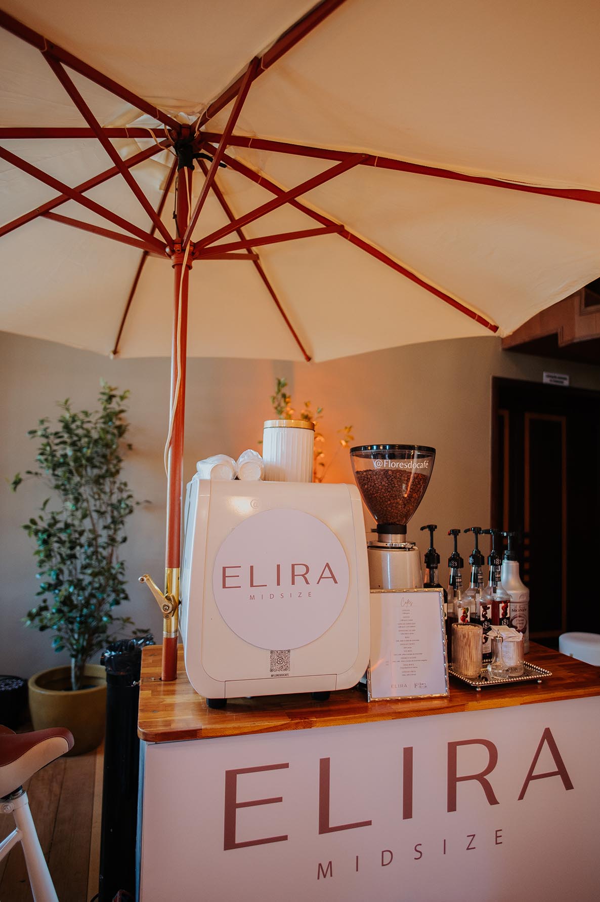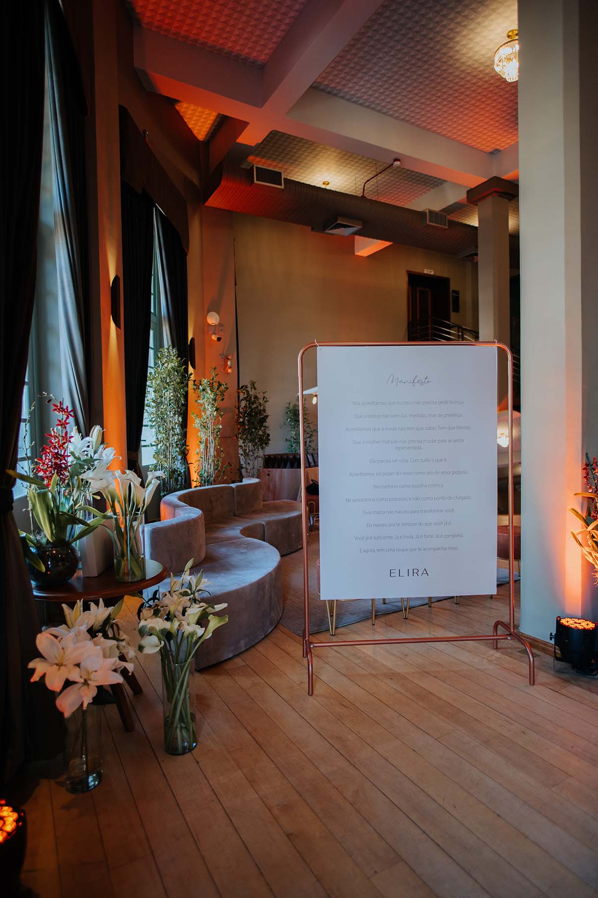 A experiência de lançamento da Elira foi concebida como uma extensão sensorial da marca. Cada elemento do evento, da ambientação ao mobiliário, dos impressos aos sabores, foi cuidadosamente planejado para refletir a identidade visual e o universo estético da Elira. A seleção de doces seguiu a cartela de cores da marca, reforçando a coerência visual por meio da gastronomia. A galeria com a primeira campanha e o carrinho de cafés personalizados funcionaram como ativações estratégicas, combinando narrativa e estímulos sensoriais para apresentar a marca de forma imersiva e memorável.